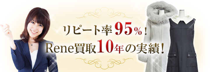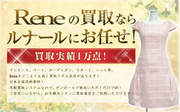 買取実績1万点!Reneの買取ならルナールにお任せ!ワンピース、コート、カーディガン、スカート、ニット等、Reneをどこよりも高く買取りする自信があります!日本全国送料無料!宅配買取システムなので、ダンボールで発送いただくだけでOK!ご自宅にいながら、お手軽カンタンに買取査定をご利用いただけます!リピート率95%!Rene買取10年の実績!